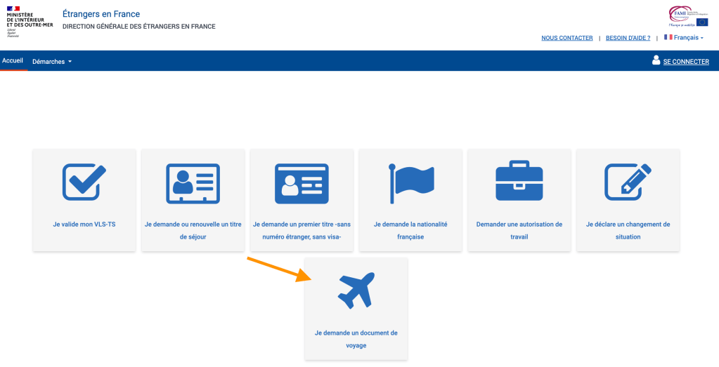 - Une fois sur le site de l’ANEF, il faut cliquer sur Je demande un document de voyage.
