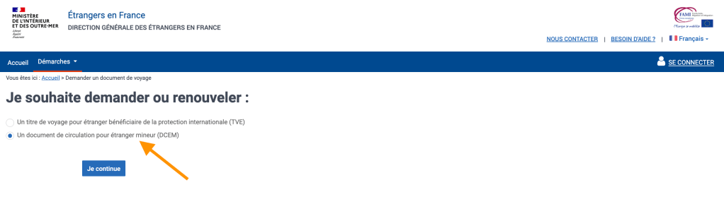 - Puis, il faut sélectionner Un document de circulation pour étranger mineur (DCEM).