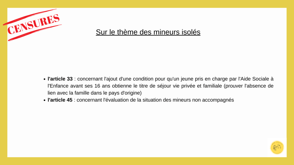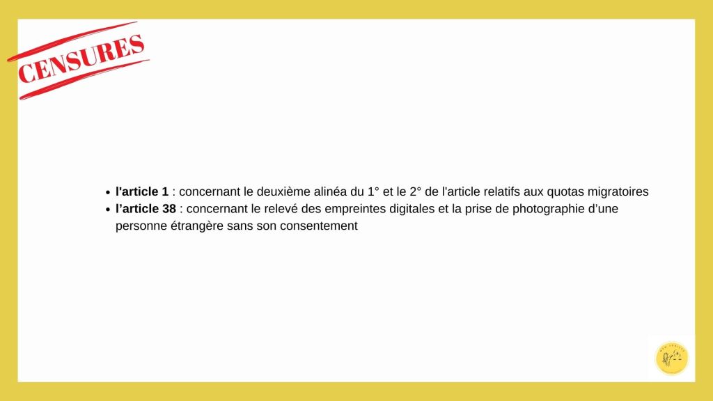Lorsque le Conseil Constitutionnel censure sur la base de ce motif, cela signifie qu’il n’a pas vérifié la constitutionnalité du fond des articles. Il a simplement constaté que ces articles n’avaient pas de lien suffisant avec l’objet et les dispositions du projet de loi initialement déposé par le Ministre de l’Intérieur, donc ces articles n’ont pas à être présent dans cette loi. Ces dispositions ne sont pas applicables.