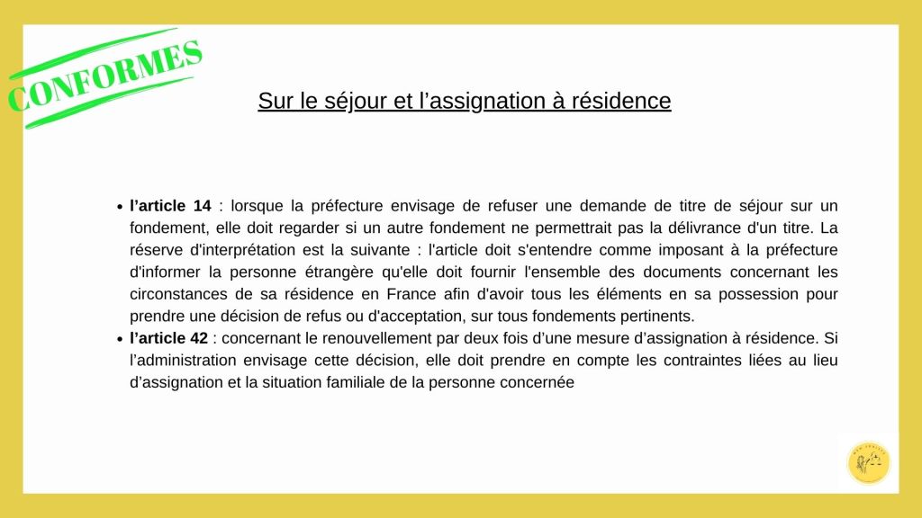 Lorsque le Conseil Constitutionnel juge conforme avec une réserve d’interprétation, c’est qu’il a examiné les dispositions à la lumière des droits et libertés consacrés dans la Constitution, et qu’il a considéré que lesdites dispositions devaient être interprétée d’une certaine manière, sinon elles porteraient une trop grande atteintes à ces droits.